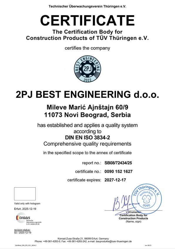 - 4. Sertifikat o usaglašenosti sa sistemom kvaliteta kod zavarivanja toljenjem metalnih materijala - Opšti zahtevi kvaliteta EN ISO 3834-2