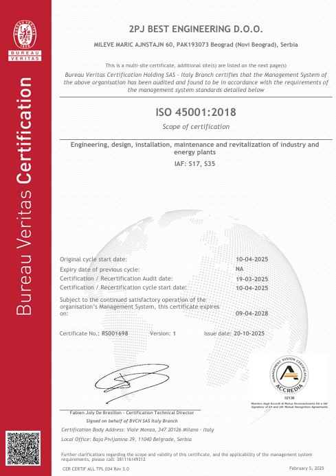 The company 2PJ BEST ENGINEERING D.O.O deals with engineering, design, assembly, maintenance, servicing and revitalization of industrial and energy plants. The mission our company's goal is to provide clients with a high level of professionalism and engagement, along with compliance with deadlines, standards, and quality assurance, as well as complete turnkey projects in the hands". We pay special attention to safety at work and ecology during our activities. The vision of our company is to develop and improve in every segment of ours actions, in order to push the boundaries of modern business and set higher standards in service as an example to its partners and competitors. Our goals are: