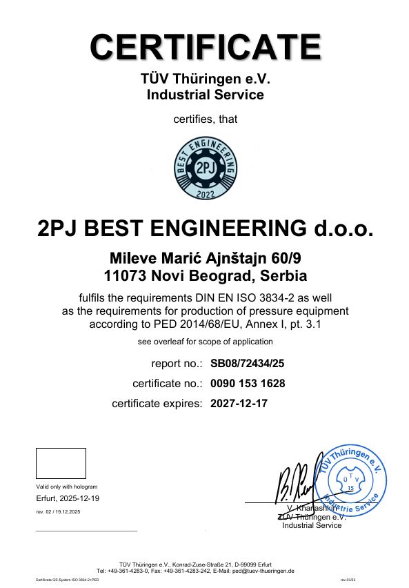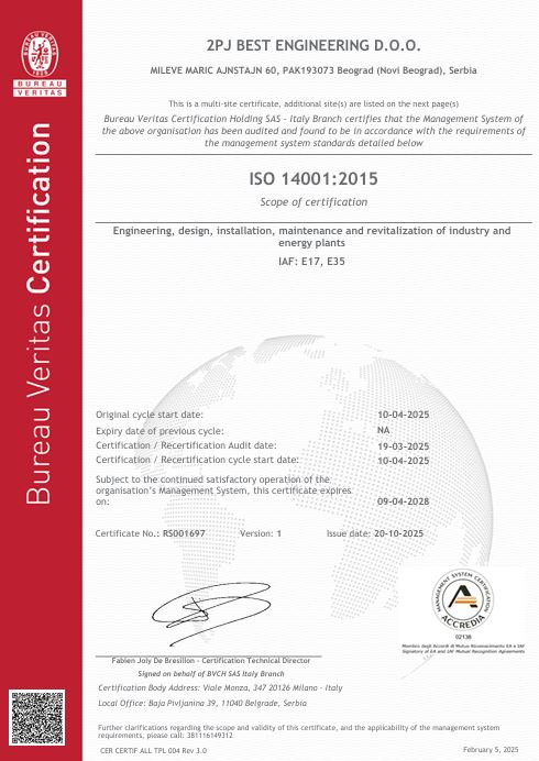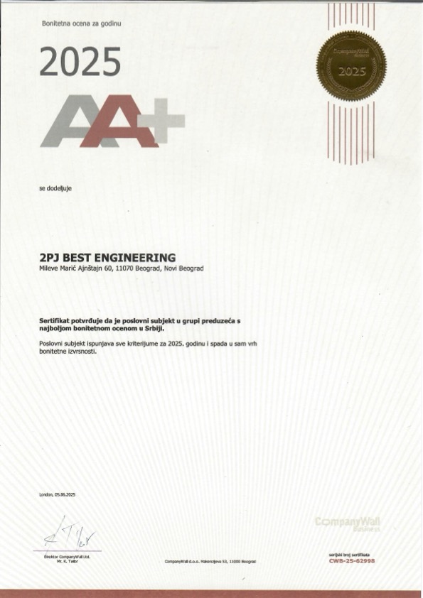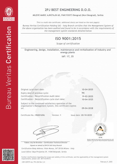The company 2PJ BEST ENGINEERING D.O.O deals with engineering, design, assembly, maintenance, servicing and revitalization of industrial and energy plants. The mission our company's goal is to provide clients with a high level of professionalism and engagement, along with compliance with deadlines, standards, and quality assurance, as well as complete turnkey projects in the hands". We pay special attention to safety at work and ecology during our activities. The vision of our company is to develop and improve in every segment of ours actions, in order to push the boundaries of modern business and set higher standards in service as an example to its partners and competitors. Our goals are: